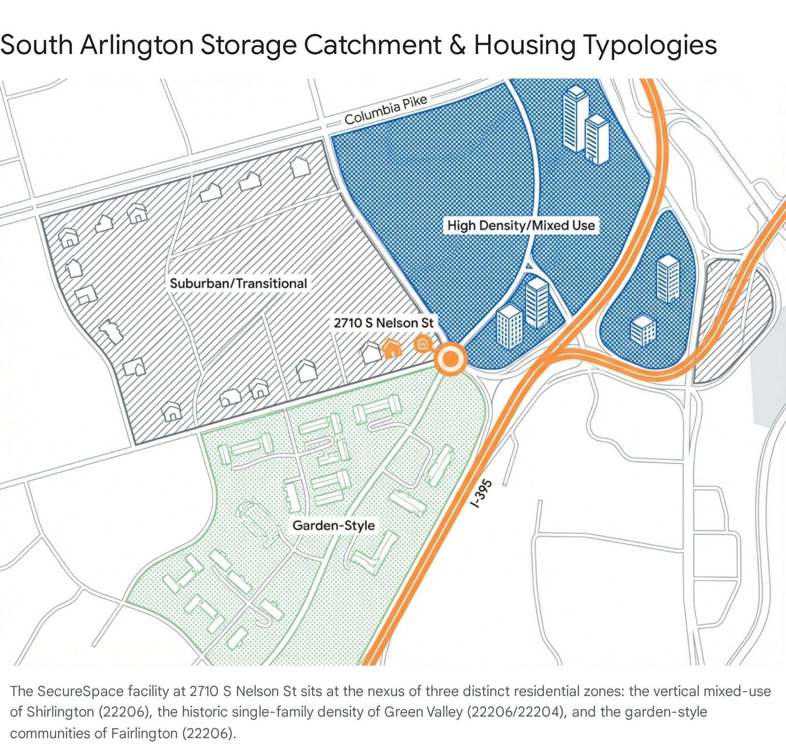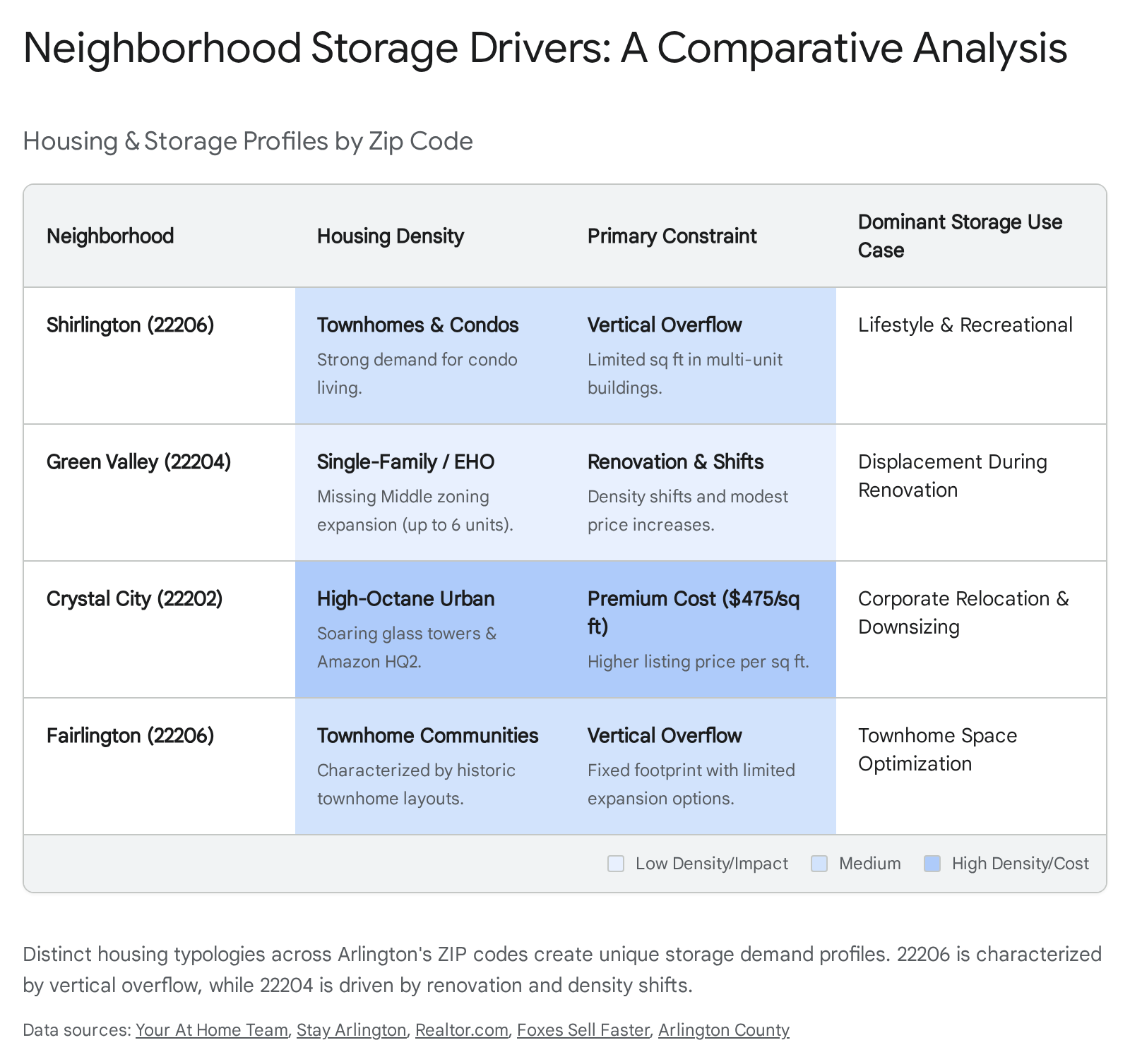 As Arlington County adopts "Missing Middle" zoning (allowing up to 6 units on single-family lots), 22204 is a prime target for redevelopment.3 This policy shift increases population density without necessarily increasing the footprint of storage available per capita. A six-plex constructed on a lot that formerly held one house means six households competing for the same cubic volume of on-site storage. External facilities like SecureSpace become the only release valve for this increased density.