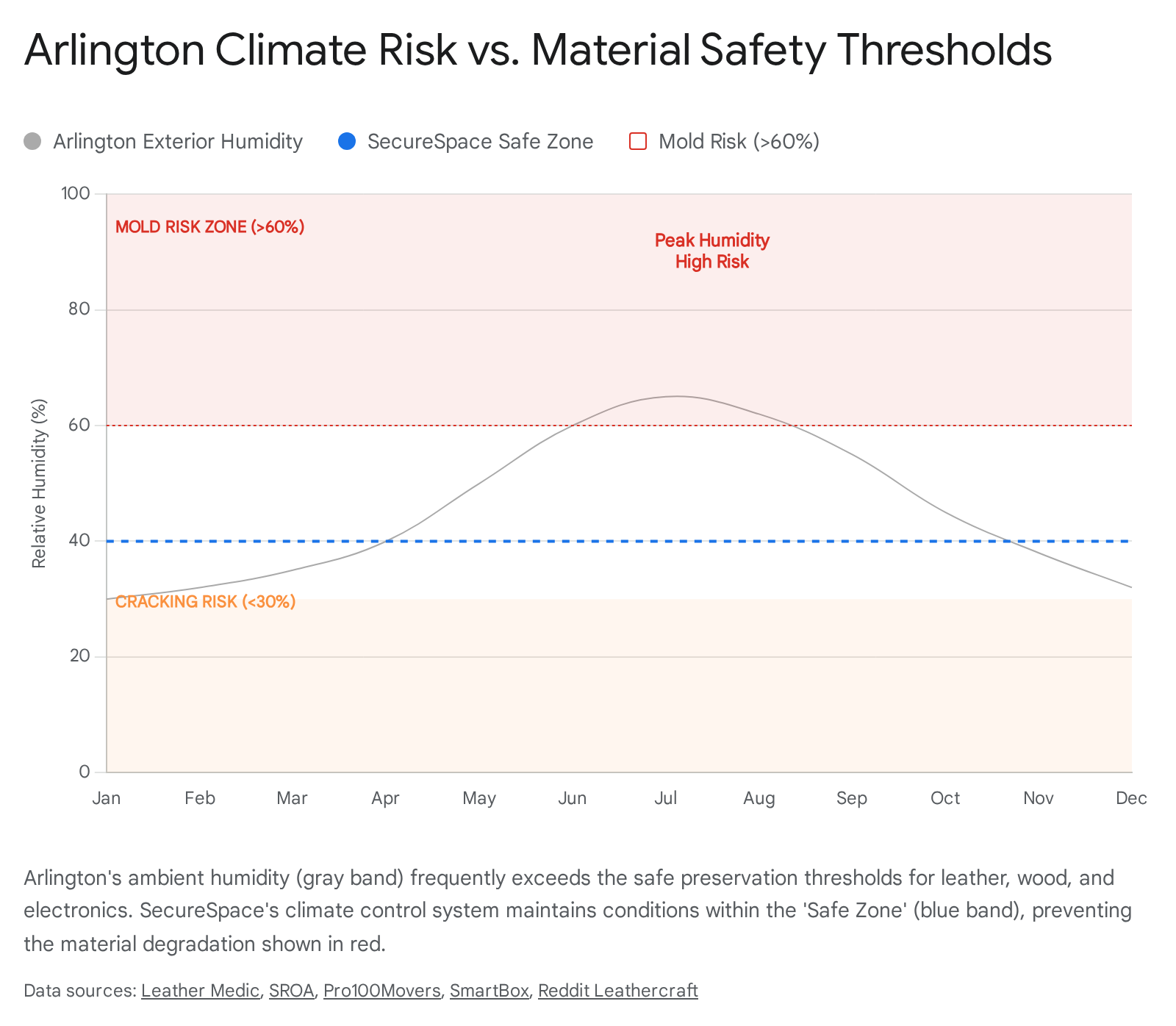 Leather Goods: A common storage item for the fashion-conscious residents of Shirlington. Leather requires an RH of 40-55%. Above 60%, it becomes a breeding ground for mildew. Below 30%, it desiccates and cracks.12 SecureSpace's regulated environment acts to keep the RH in the "Goldilocks zone," preventing irreversible biological and structural damage.