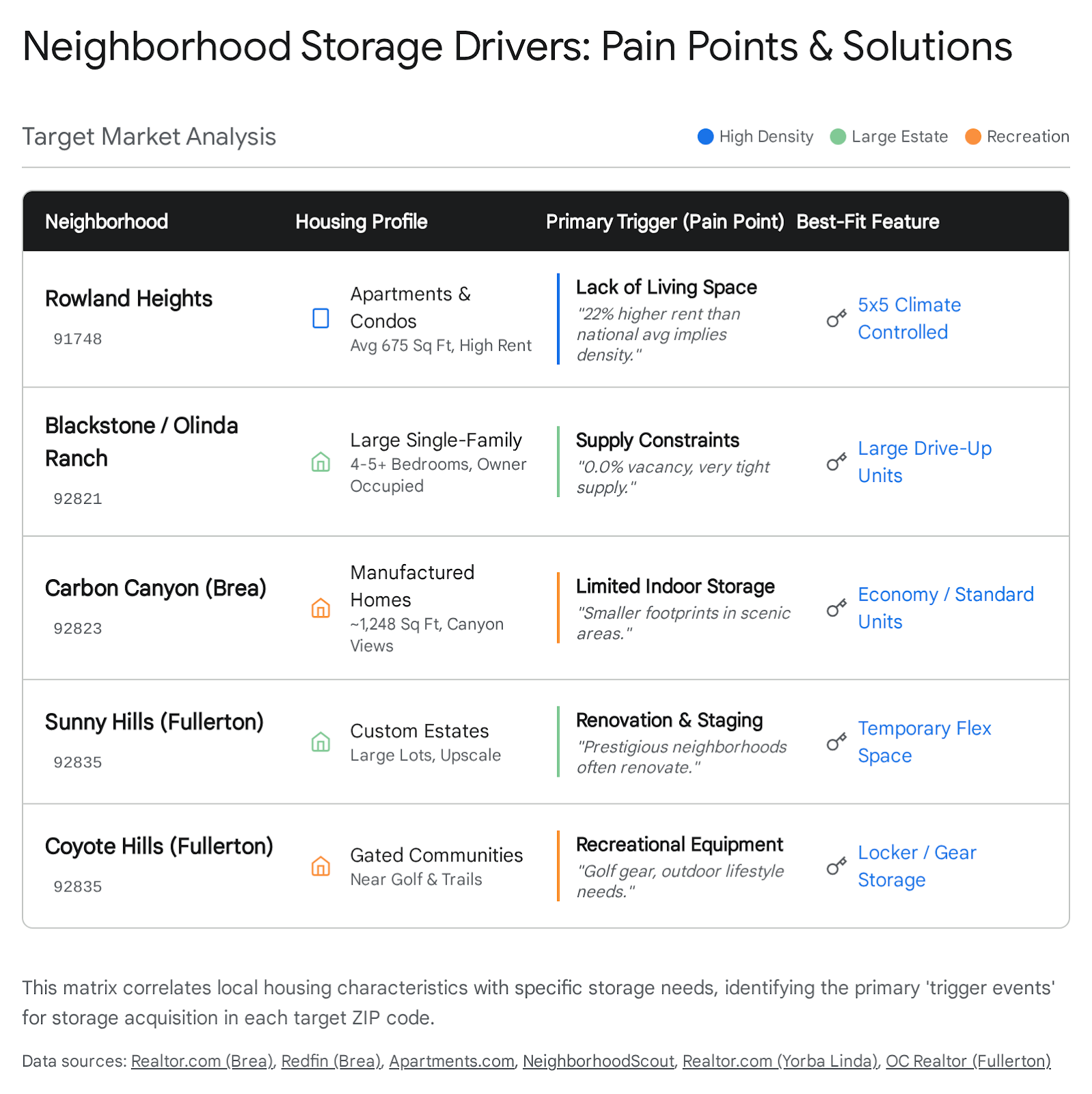 The "Mixed Market" lens requires us to dissect the storage needs based on the specific housing typologies found in the target ZIP codes. The storage requirements of a homeowner in a 4,000 sq. ft. estate in Yorba Linda differ fundamentally from those of a student renter in a 700 sq. ft. apartment in Fullerton.