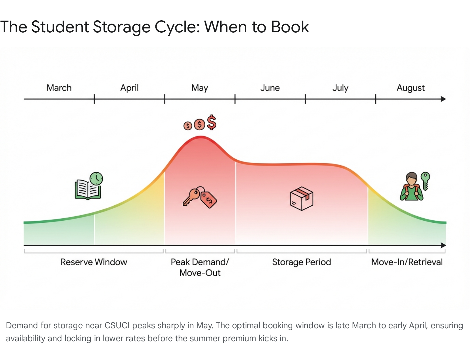 May (The Move-Out Surge): As the spring semester ends, students must vacate dorms like Santa Cruz and Anacapa villages rapidly. Demand for small units—specifically 5x5 and 5x10 sizes—spikes dramatically. Prices often rise in April in anticipation of this surge.
