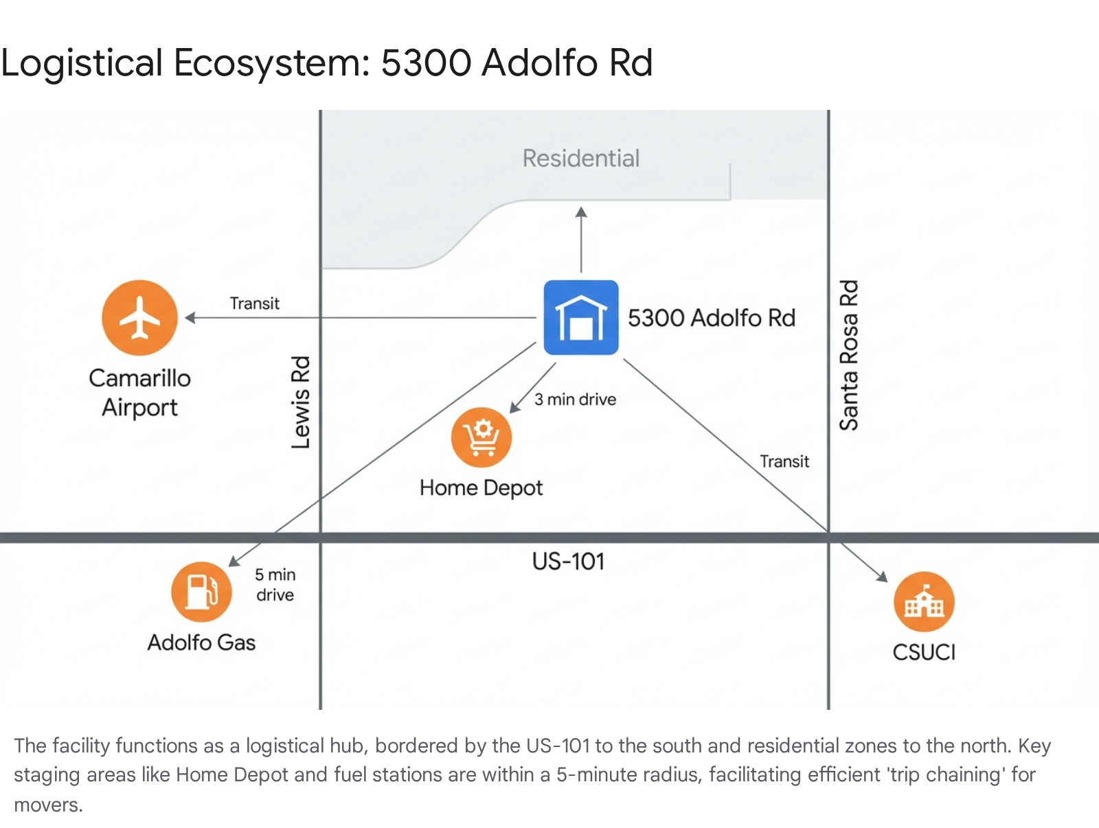 The facility at 5300 Adolfo Road occupies a strategic position in the logistical anatomy of eastern Camarillo. Situated immediately adjacent to the US-101 freeway, it sits at the precise intersection where residential tranquility meets industrial utility.1 This location is not merely a geographic coordinate; it is a functional asset that defines the user experience. The facility is nestled between the Mission Oaks residential tract to the north and east, and the Camarillo Airport industrial zone to the west.1 For the user, this means the site is easily accessible via the Santa Rosa Road or Lewis Road exits off the 101, providing dual ingress/egress options that can be critical during peak traffic hours.