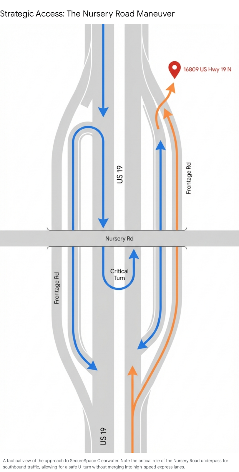 The Navigation: To access the facility at 16809 US Hwy 19 N, southbound drivers must execute a U-turn. The strategic value of this location is the Nursery Road underpass. Unlike surface-level median U-turns, which can be terrifying in heavy traffic, the Nursery Road intersection allows drivers to exit the express lanes, wait for a signal, and make a protected U-turn under the highway. This is critical for anyone towing a boat or driving a rented moving truck. It transforms a stressful maneuver into a routine turn.12