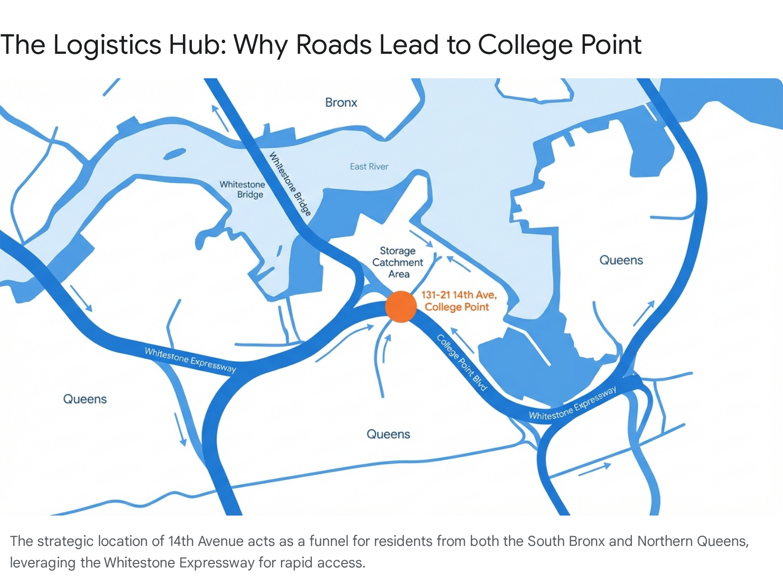 The Bronx-Whitestone Bridge is the critical artery connecting these markets. From Soundview (10473) or Castle Hill (10462), the drive is a straightforward shot down the Bruckner Expressway, over the bridge, and immediately off at the first exit in Queens.14 This route avoids the deep, often gridlocked traffic of Flushing's Main Street or Northern Boulevard. The facility at 131-21 14th Ave is positioned almost immediately at the base of the bridge’s landing in College Point, making it highly accessible. The "toll factor" is a consideration, but many residents view it as a worthwhile premium for accessing a facility that is secure, modern, and easy to navigate compared to older industrial stock in the Bronx.