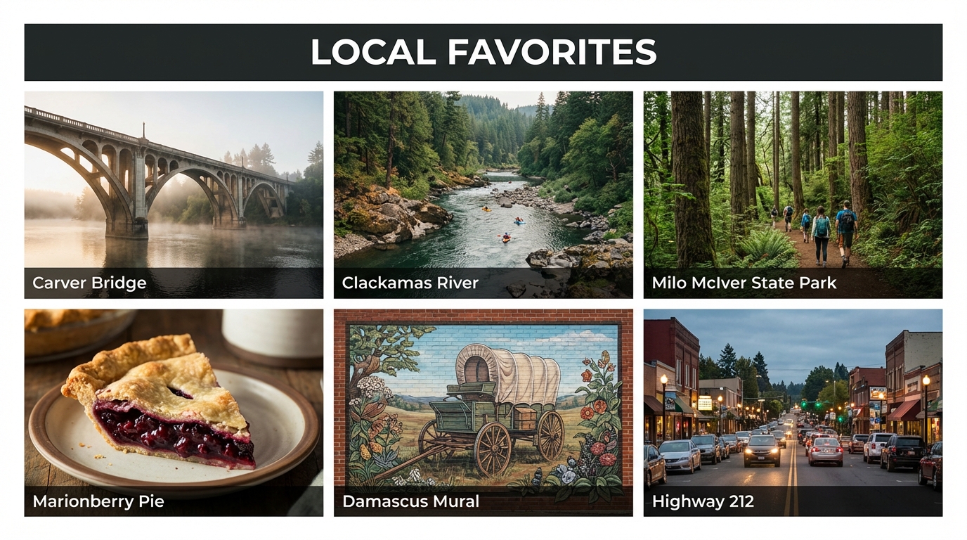 From Damascus, head north on SE 242nd/222nd Dr or SE Foster Rd, connect to SE 172nd Ave, then west to SE Division St and continue to 16061 SE Division St. Trips are typically 12–22 minutes.