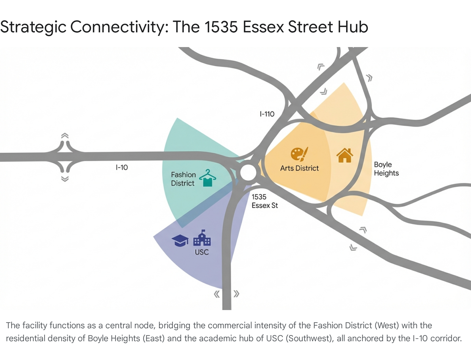 The site at 1535 Essex Street functions as a strategic anchor within the "Wholesale District/Arts District" zone of the 90021 zip code.2 Its location is defined primarily by its adjacency to the Interstate 10 (Santa Monica Freeway), the primary east-west artery of Southern California.2 This adjacency is not merely a feature of convenience but a fundamental logistical asset. For residents in the dense urban cores of the Historic Core (90013) or Bunker Hill (90012), accessing storage often involves navigating the congested surface streets of downtown. However, the Essex Street location allows for direct freeway access via exits such as San Pedro Street (Exit 14B) and Central Avenue (Exit 15A), bypassing the internal gridlock of the city center.5