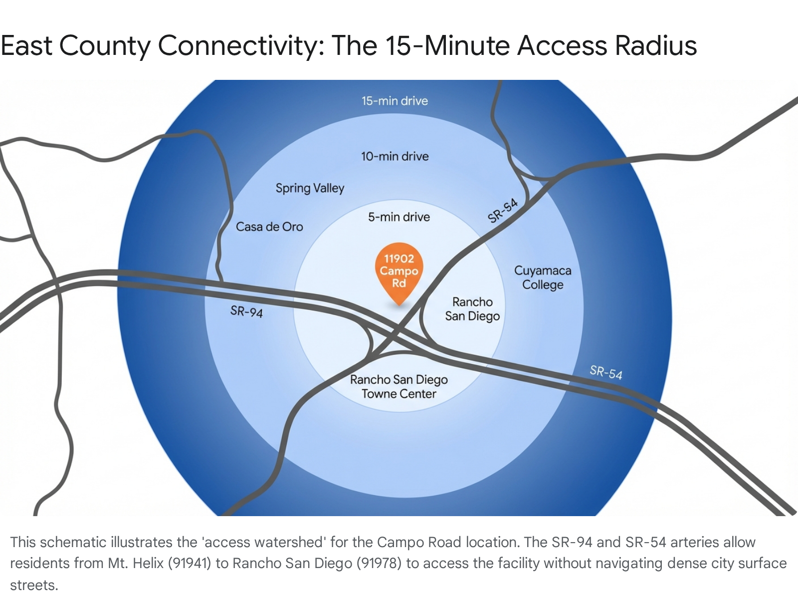 In the realm of self-storage, geography is the primary determinant of long-term satisfaction. A facility may possess superior architectural features, but if its location requires the user to navigate a congested, single-lane choke point or perform a hazardous u-turn against oncoming commuter traffic, its utility is fundamentally compromised. The site at 11902 Campo Road occupies a specific and highly strategic node in the East County transit network—often referred to locally as the "Jamacha Junction"—where State Route 94 intersects with State Route 54.6