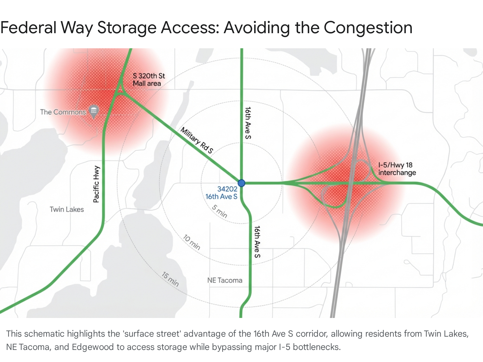 The "Commuter Shield": Residents here face a significant psychological and physical barrier when it comes to driving south into Tacoma for services: the congestion around the Port of Tacoma and the infamous I-5 curve.14 Driving north on local roads (like Norpoint Way NE which turns into 16th Ave S) is often faster, more predictable, and less stressful. This makes a Federal Way storage location practically more accessible than one in Tacoma proper.