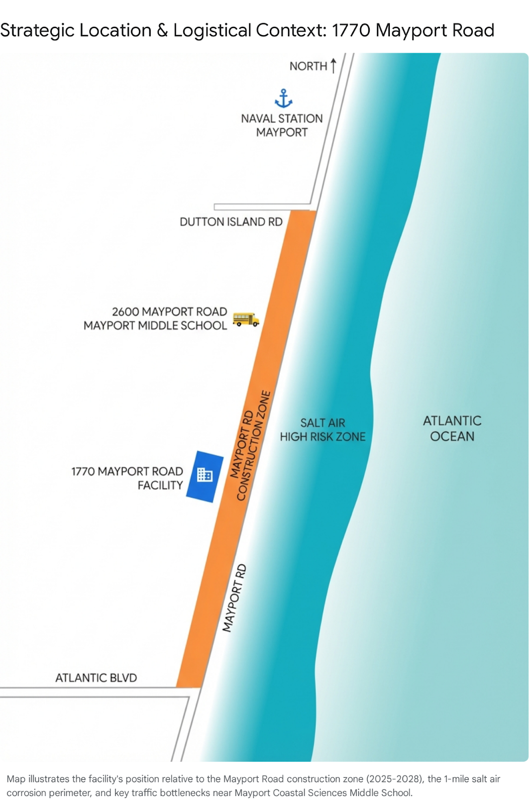 The facility's location places it in close proximity to two major educational institutions: Mayport Coastal Sciences Middle School (2600 Mayport Rd) 24 and Atlantic Beach Elementary. Traffic patterns in the immediate area are heavily dictated by the rigid schedules of these schools.