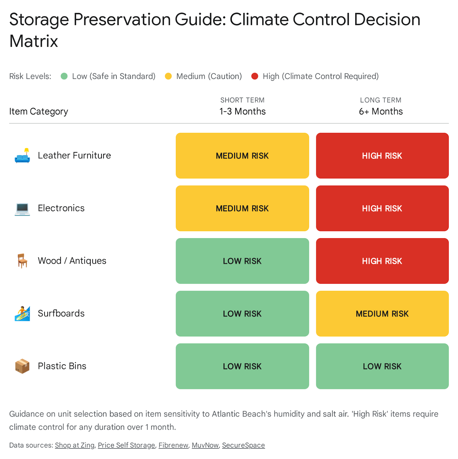 Surfboards: A quintessential Atlantic Beach item, surfboards are often stored improperly. Contrary to popular belief, surfboards should not be stored in extreme heat. The heat causes the foam core to expand, which can lead to delamination—the structural failure where the fiberglass shell separates from the foam core.34 A climate-controlled unit prevents this expansion, preserving the board's structural integrity and value.