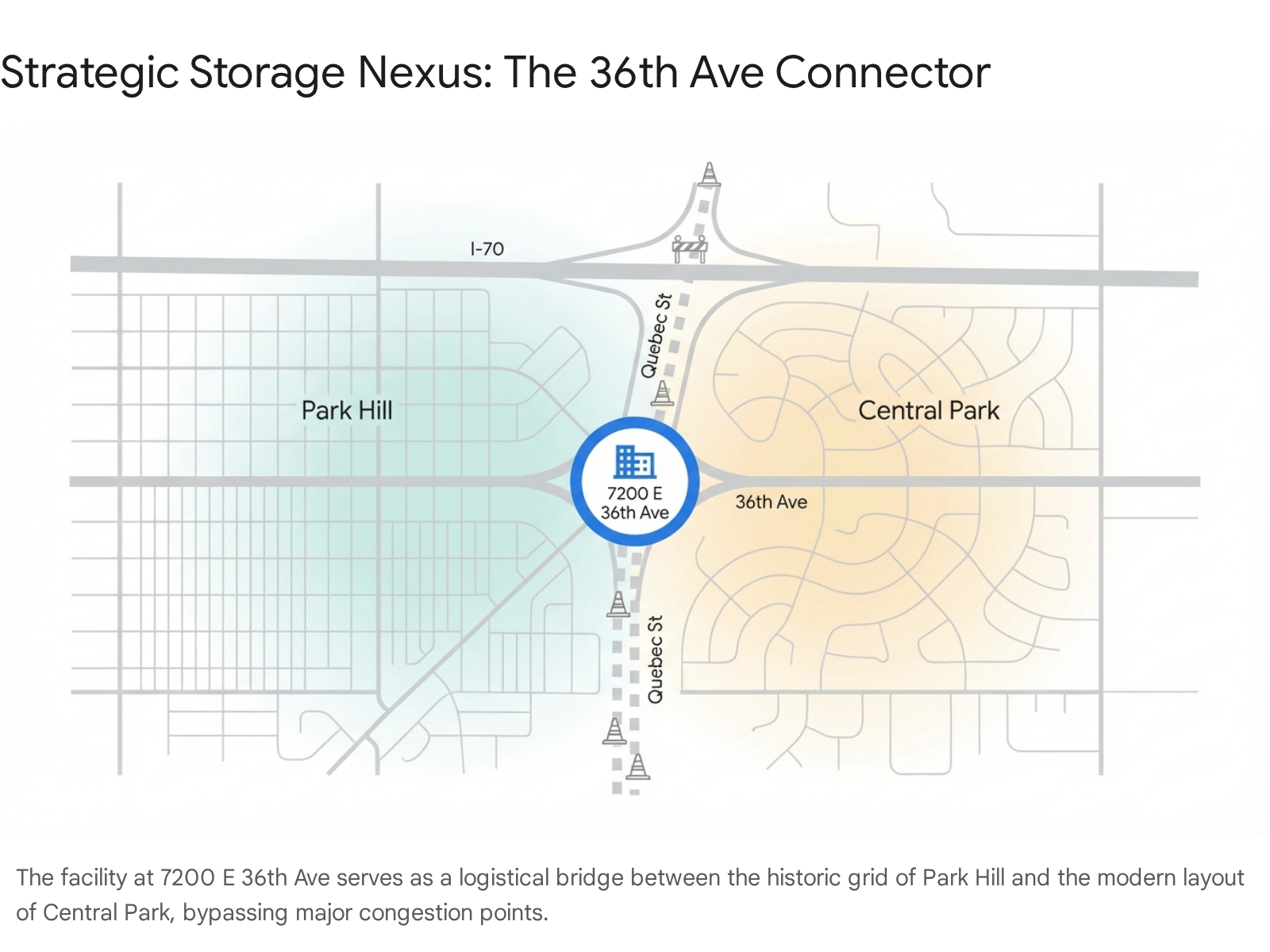 For a resident of South Park Hill (80220) or Hale, driving north to a storage unit can feel like running a gauntlet if one blindly follows a GPS route that prioritizes Quebec Street. The strategic advantage of the location at 7200 E 36th Ave lies in its East-West orientation. 36th Avenue acts as a critical "local bypass," a pressure relief valve that allows savvy residents to skirt the heaviest zones of congestion.
