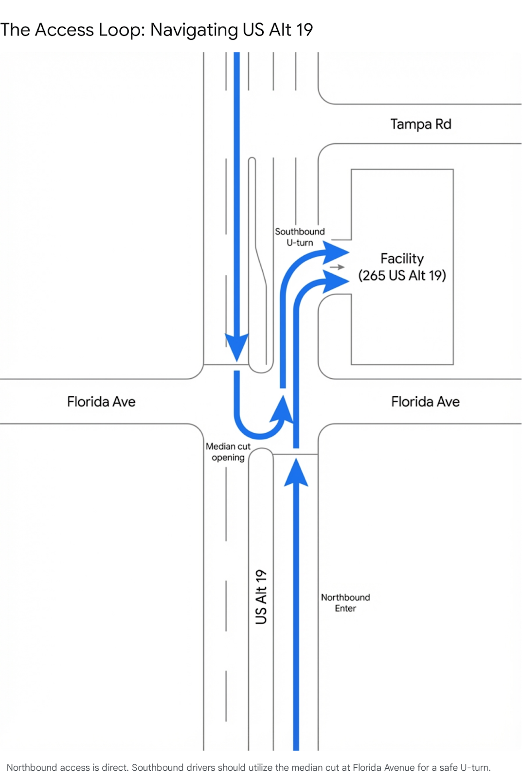 Southbound Arrival: For residents coming from Tarpon Springs or Innisbrook (driving South on Alt 19), the raised median prevents a direct left turn into the facility. Drivers will need to proceed to the nearest designated median cut—often located at Florida Avenue or Tampa Road—to execute a U-turn and approach the facility from the Northbound lane.26