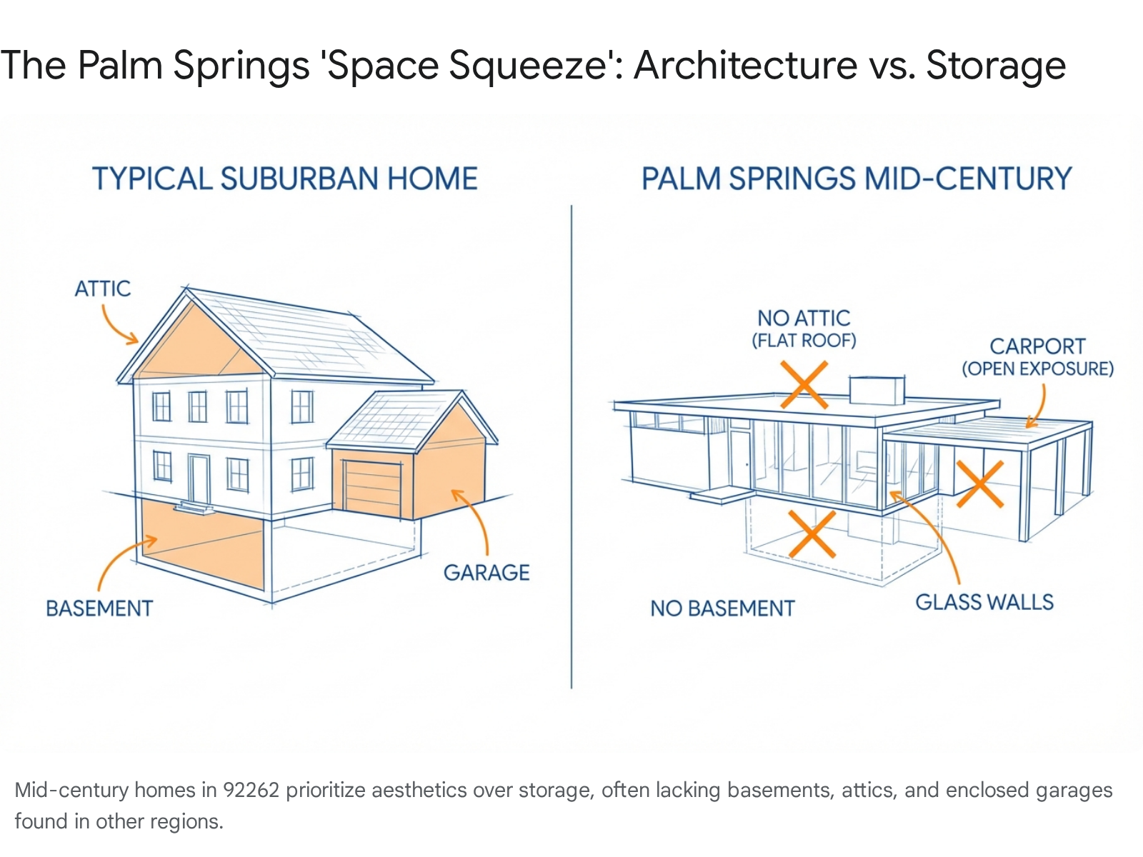 Flat or Butterfly Roofs: Unlike traditional pitched roofs which create attic space, the iconic rooflines of Palm Springs maximize mountain views but offer zero overhead storage.