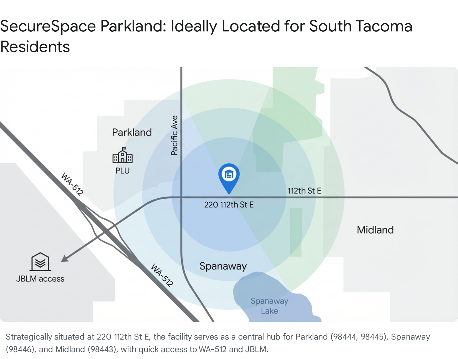 The SecureSpace Self Storage facility located at 220 112th St E, Tacoma, WA 98445 sits at a unique geographical and logistical fulcrum. It is positioned near the intersection of Pacific Avenue (State Route 7) and 112th Street East, just moments from the WA-512 interchange.1 For locals, this intersection is more than just a set of coordinates; it is a daily crossroads. It connects the dense, historic suburban grids of Parkland with the semi-rural expanses of Midland and the rapidly developing residential neighborhoods of Spanaway.