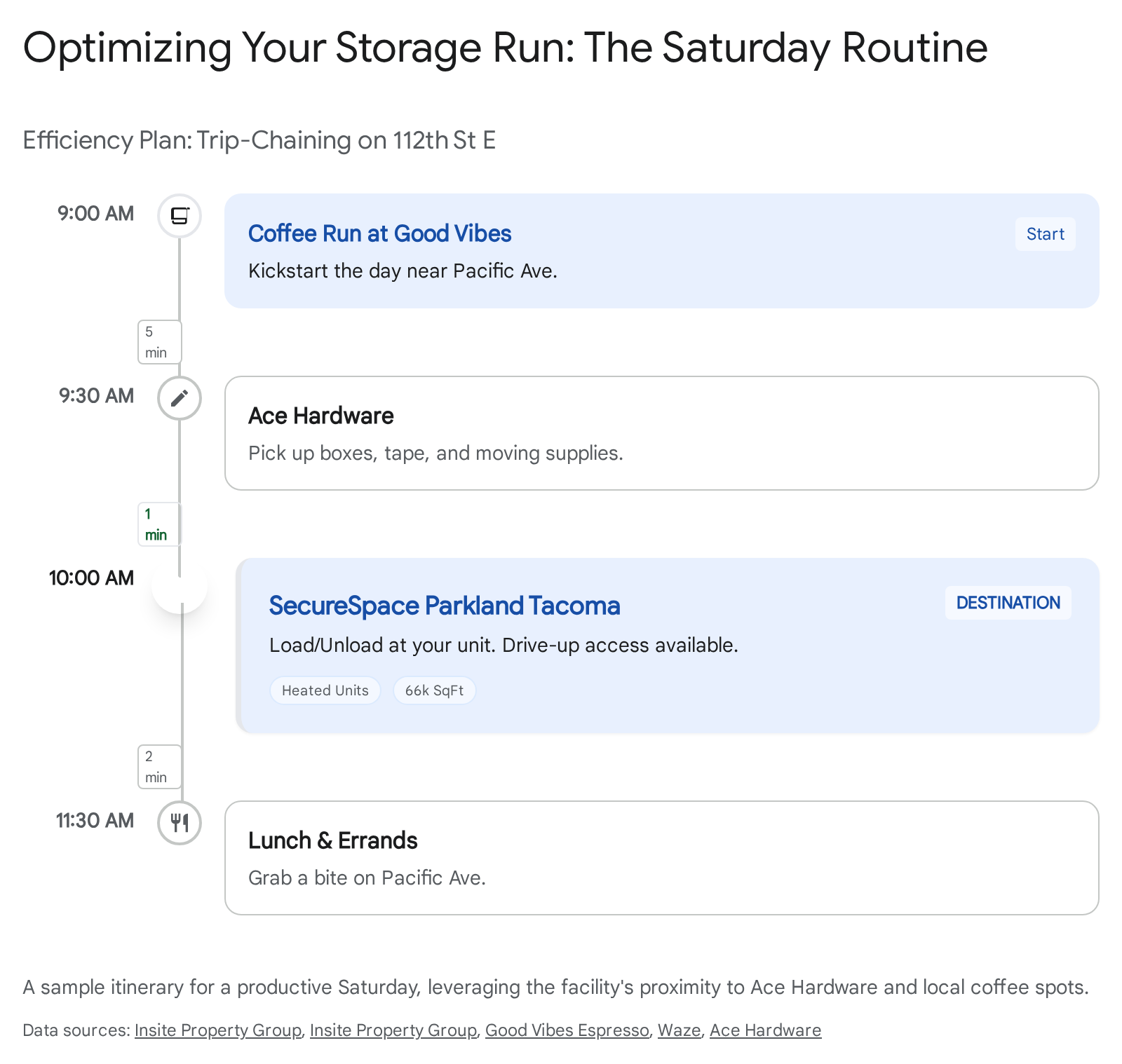 Integrating a storage stop into your routine makes it feel less like a chore and more like a simple errand. The location at 220 112th St E is positioned near high-frequency errand points, allowing you to "trip-chain" effectively. This concept of trip-chaining—combining multiple stops into a single outing—is the key to efficiency in suburban environments like Parkland.