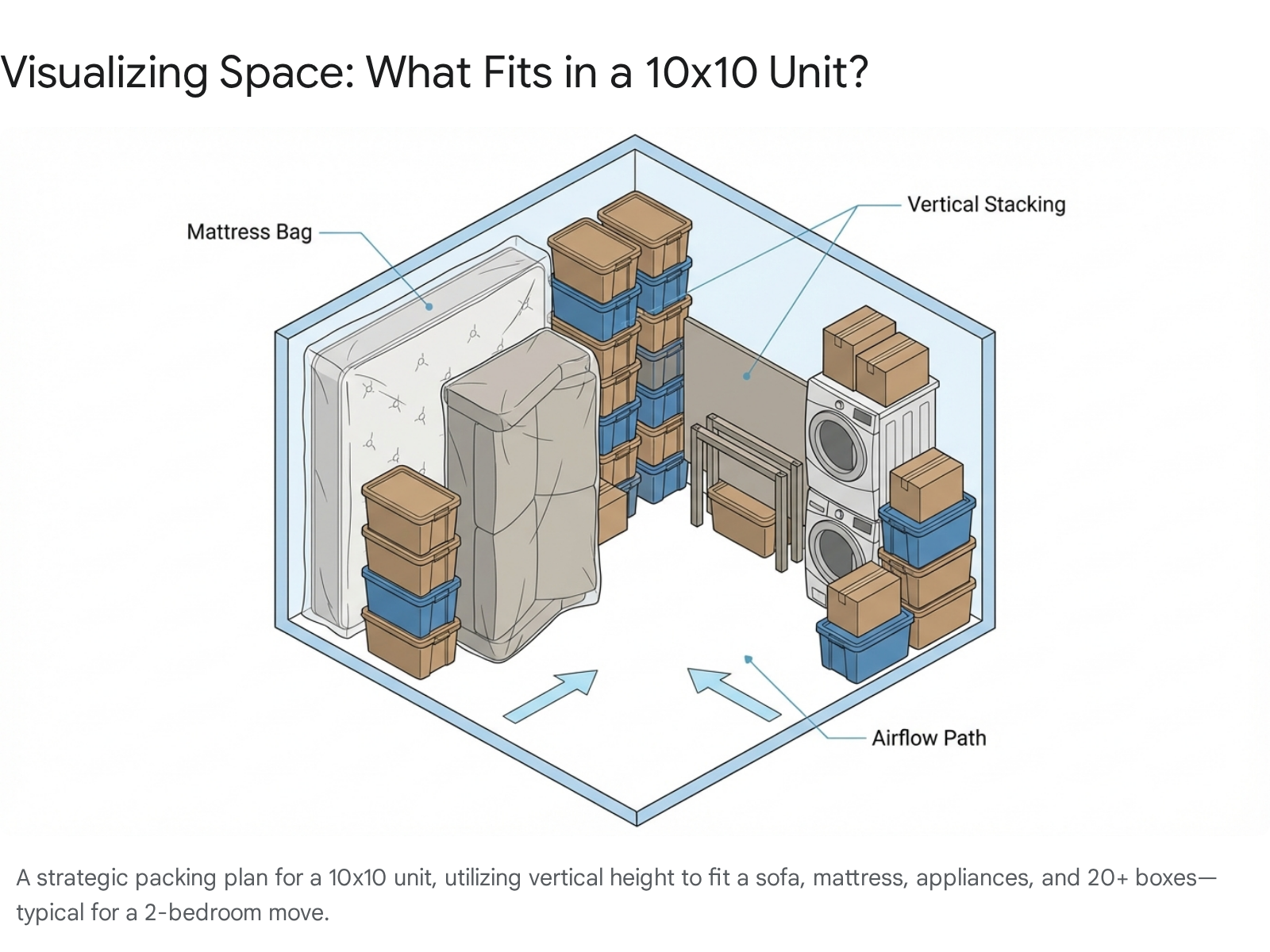 The Solution: The verticality of the storage unit becomes your best friend. A 10x10 unit offers 800 cubic feet of space. Because your furniture is likely disassembled, you can stack components much higher and more densely than you could in a moving truck. However, this requires a "tetris-mindset" and rigorous labeling of hardware bags.9