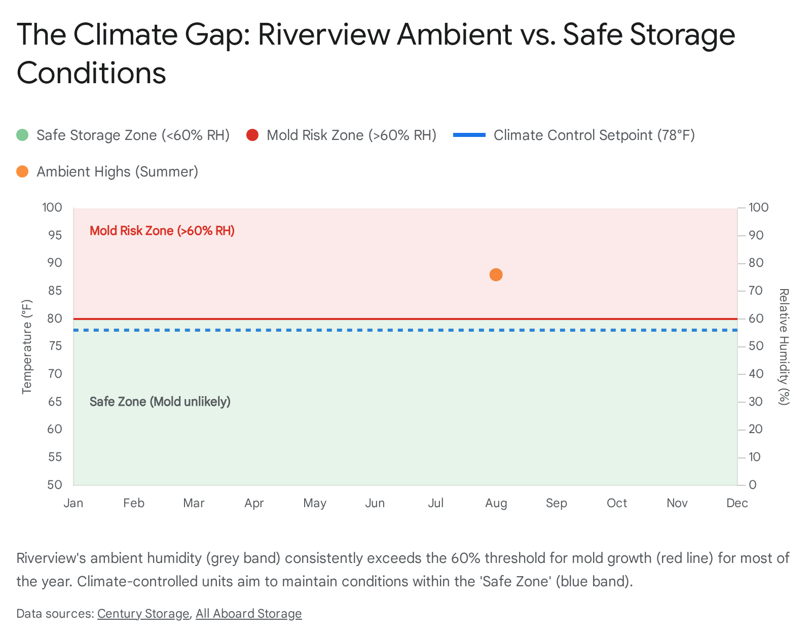 Riverview’s climate is classified as humid subtropical, but for storage purposes, it should be viewed as "hostile." The combination of high heat and saturation-level humidity poses a direct, chemical threat to stored goods.