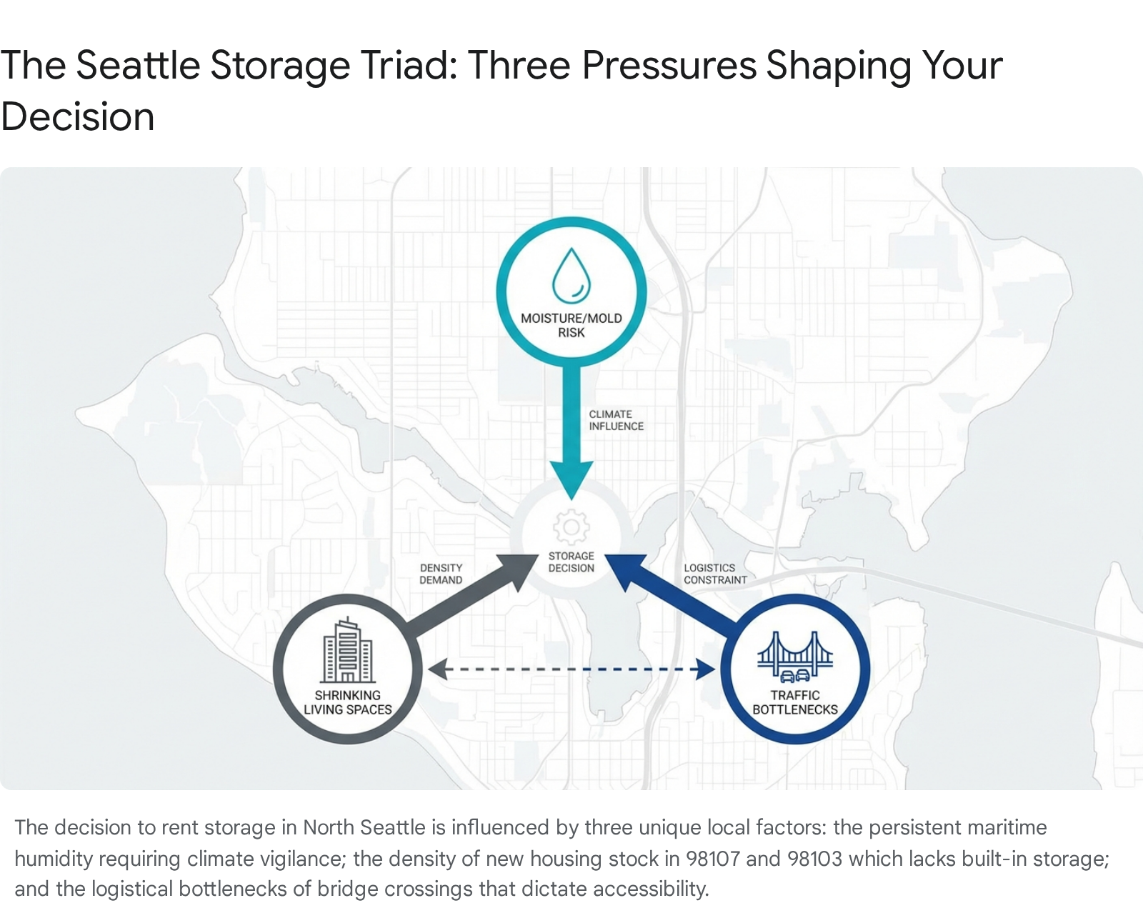 This report serves as a definitive, expert-level guide for residents actively researching storage solutions in this hyper-local market. It moves beyond superficial marketing rhetoric to address the substantive "in-between" questions that define the user experience: the physics of moisture control in a marine climate, the logistical choreography of navigating the Ballard Bridge during peak maritime traffic, and the spatial geometry required to fit a modern one-bedroom apartment into a storage unit. By analyzing the interplay between local geography, climate science, and urban housing trends, this document aims to equip the reader with the insights necessary to make a low-stress, durable decision that aligns with the realities of life in Seattle.