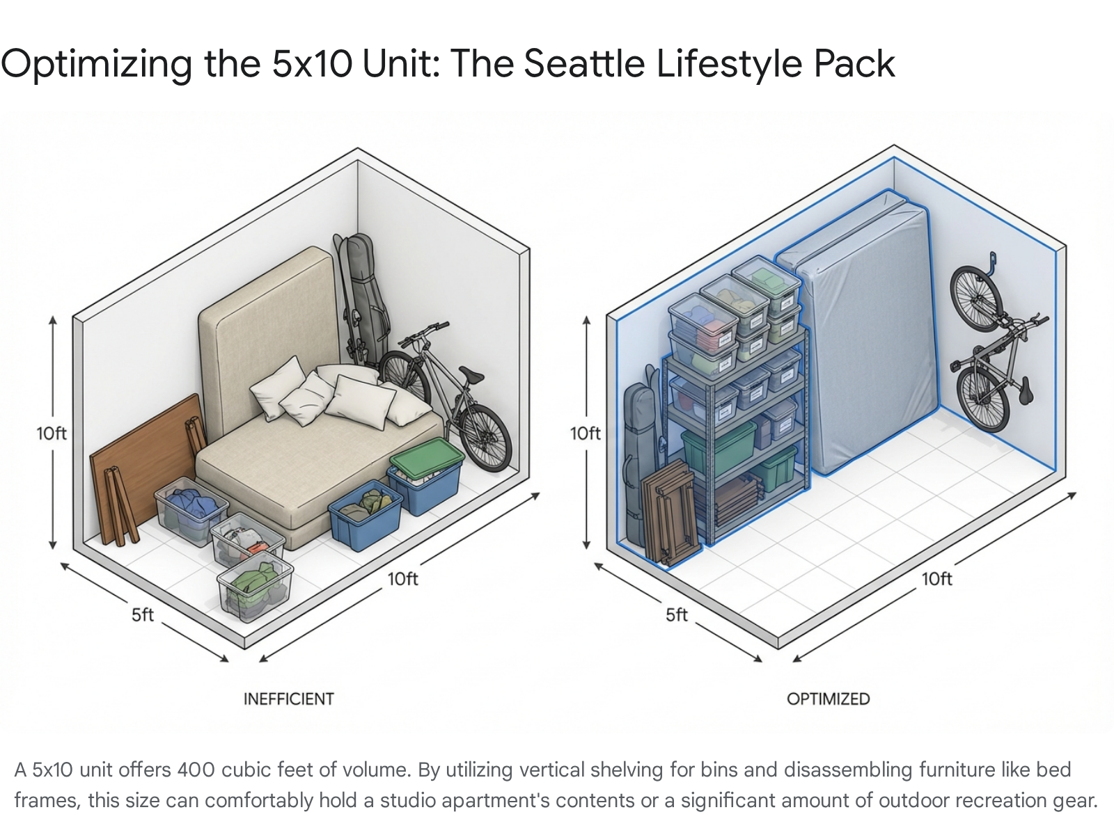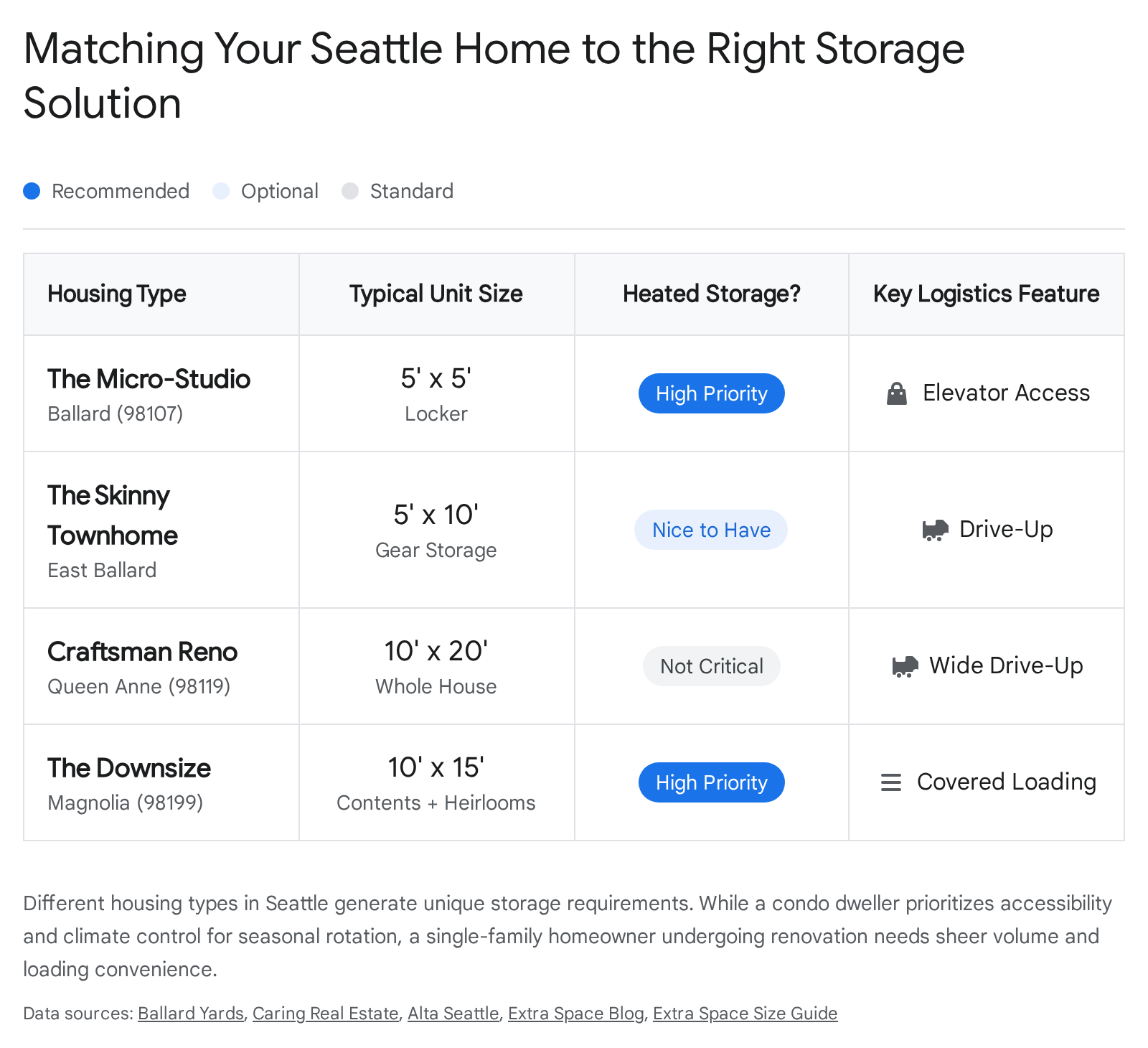 The following table translates common Seattle housing scenarios into specific storage unit requirements, based on typical local floor plans.