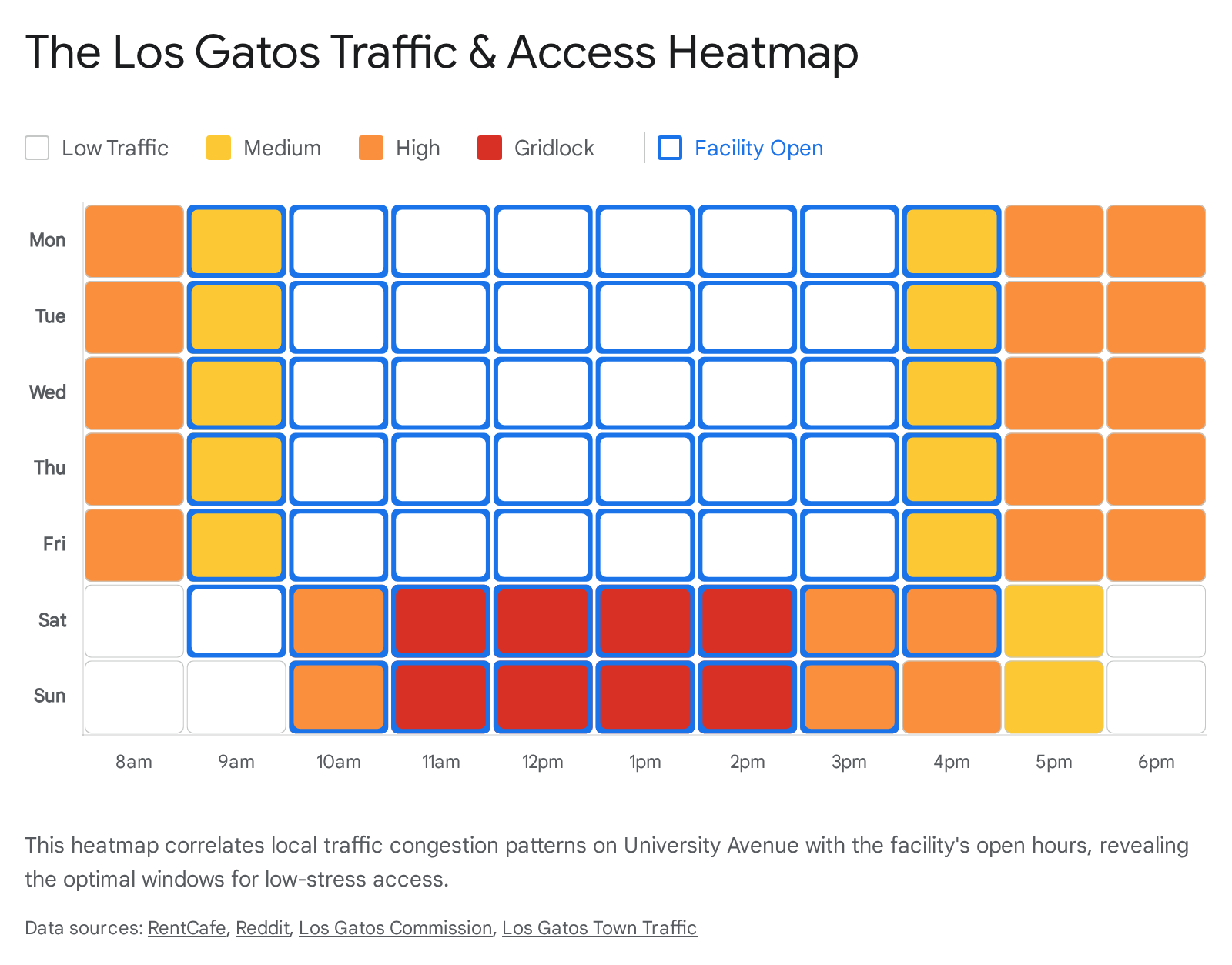 No decision regarding real estate or services in Los Gatos can be made without addressing the "Beach Traffic" phenomenon. This is the single most significant external variable affecting the usability of the 688 University Avenue facility.