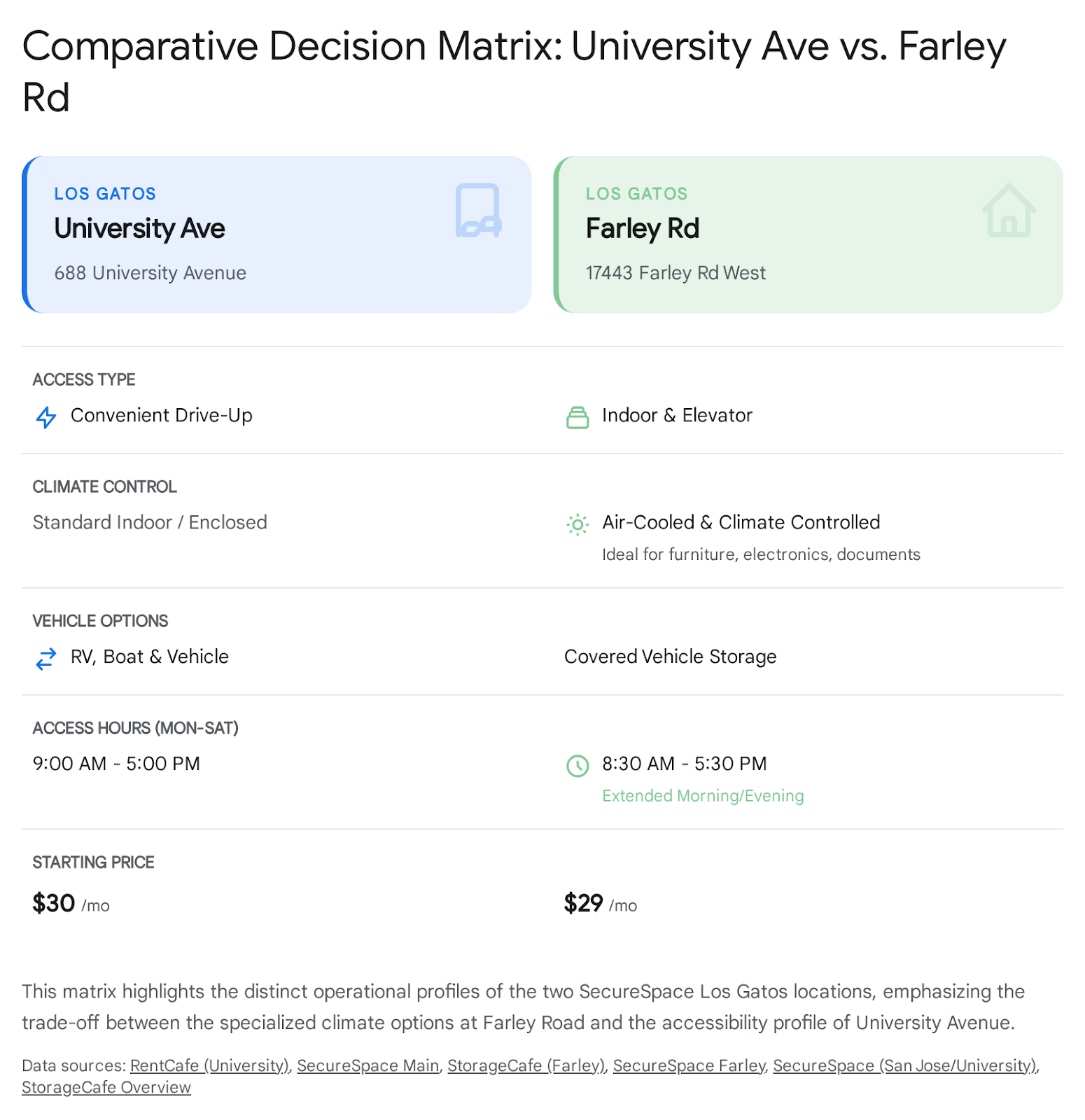 The findings indicate that while 688 University Avenue offers superior accessibility for downtown residents and modern security infrastructure, its operational utility is heavily modulated by the Town of Los Gatos's traffic ecosystem and strict access hours. It stands as a distinct entity from its sister facility on Farley Road, with the latter serving as the specialized hub for wine and vehicle storage, while University Avenue functions as the primary solution for household overflow and renovation staging.1