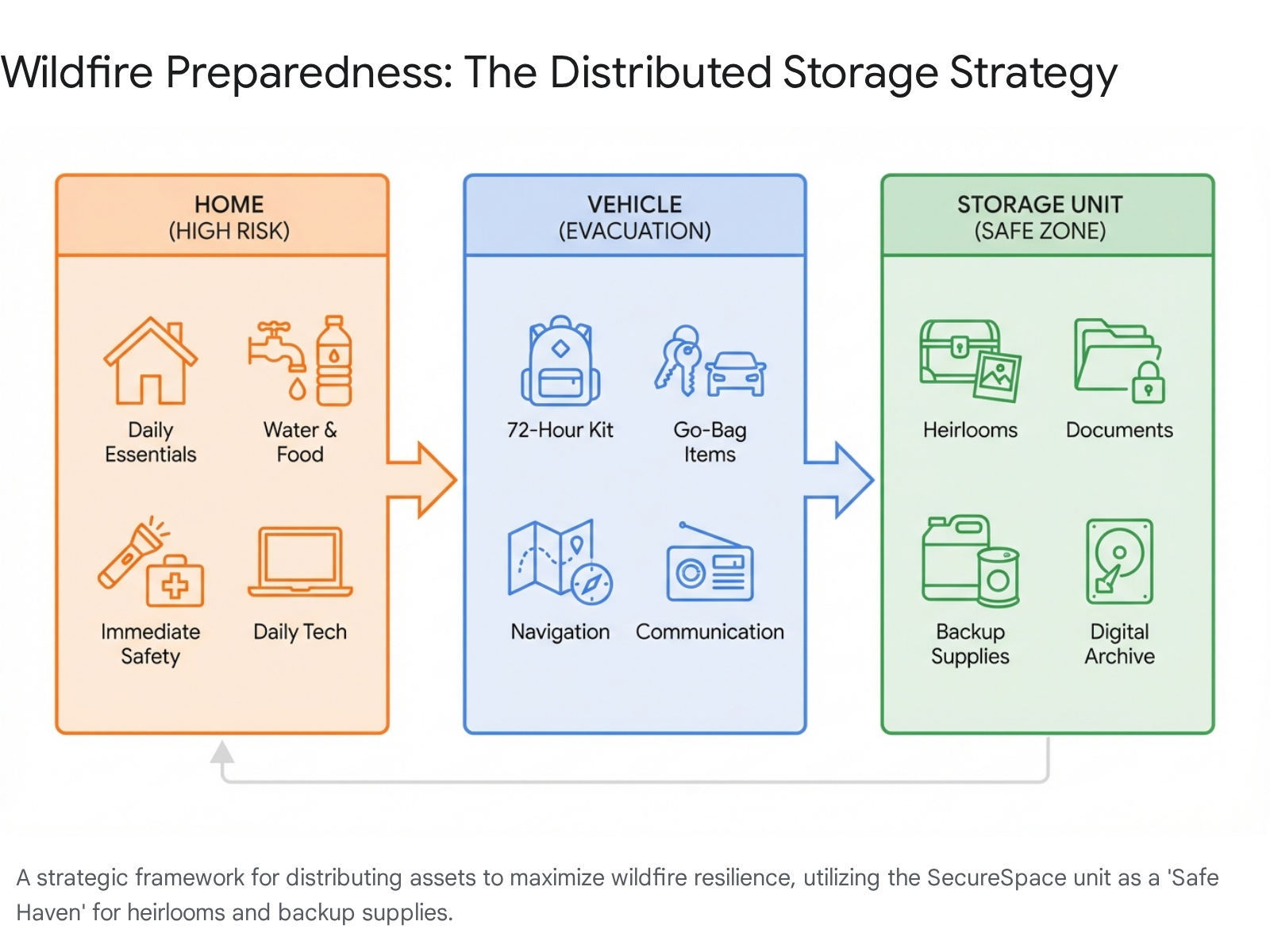 The "Go Bag" Extension: While immediate emergency supplies belong in the vehicle, the storage unit serves as a secondary cache for items that are valuable but not immediately essential for survival—family photo albums, heirlooms, hard drives with data backups, and important legal documents. By storing these items "down the hill," residents reduce the psychological load during an evacuation. They can leave their homes knowing their history is already safe.25