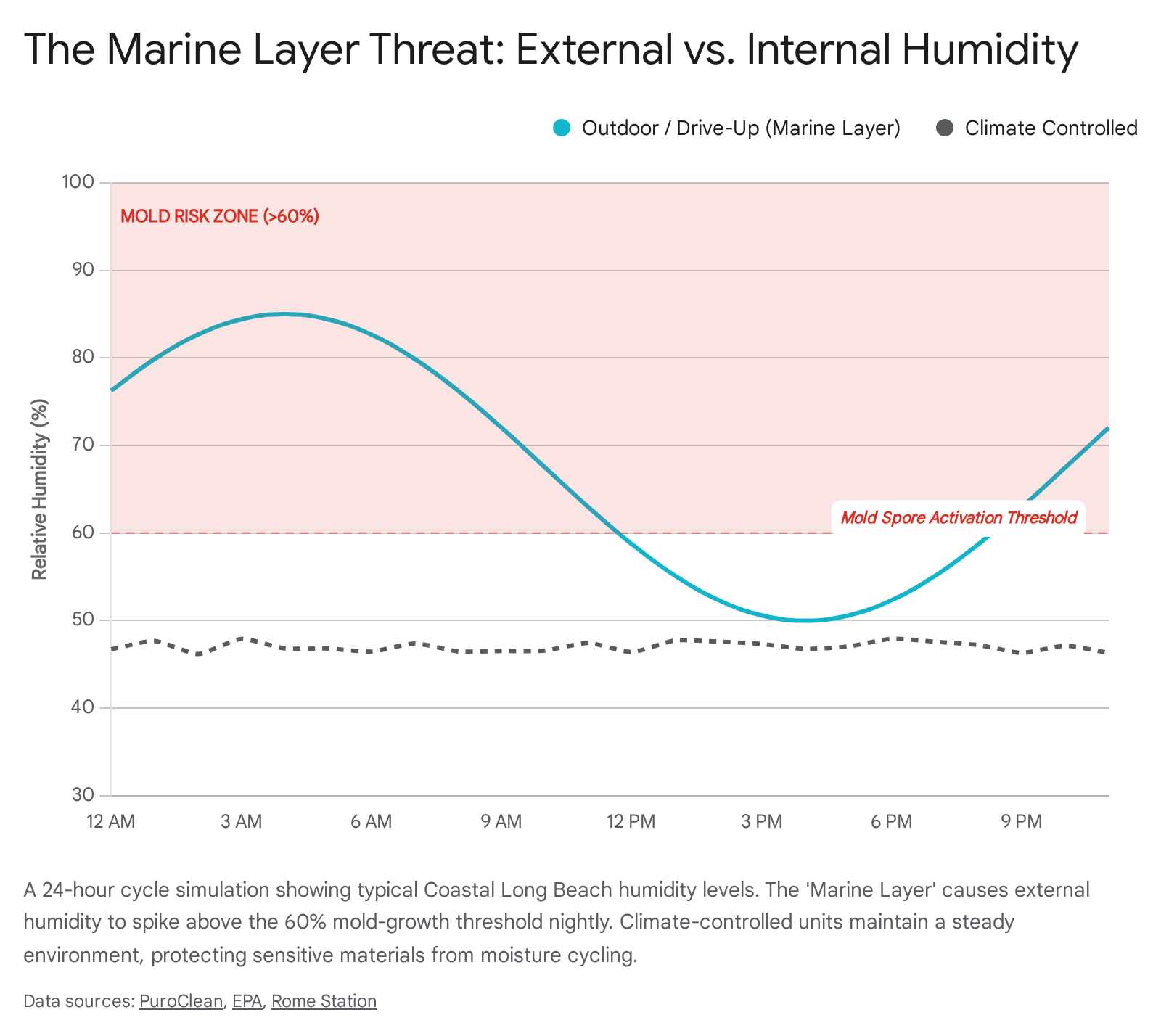Signal Hill is located roughly 2.5 miles from the Pacific Ocean, placing it directly in the path of the "Marine Layer"—a cool, wet air mass that rolls in overnight and often lingers until noon.3 This atmospheric phenomenon creates a specific risk profile for stored goods.