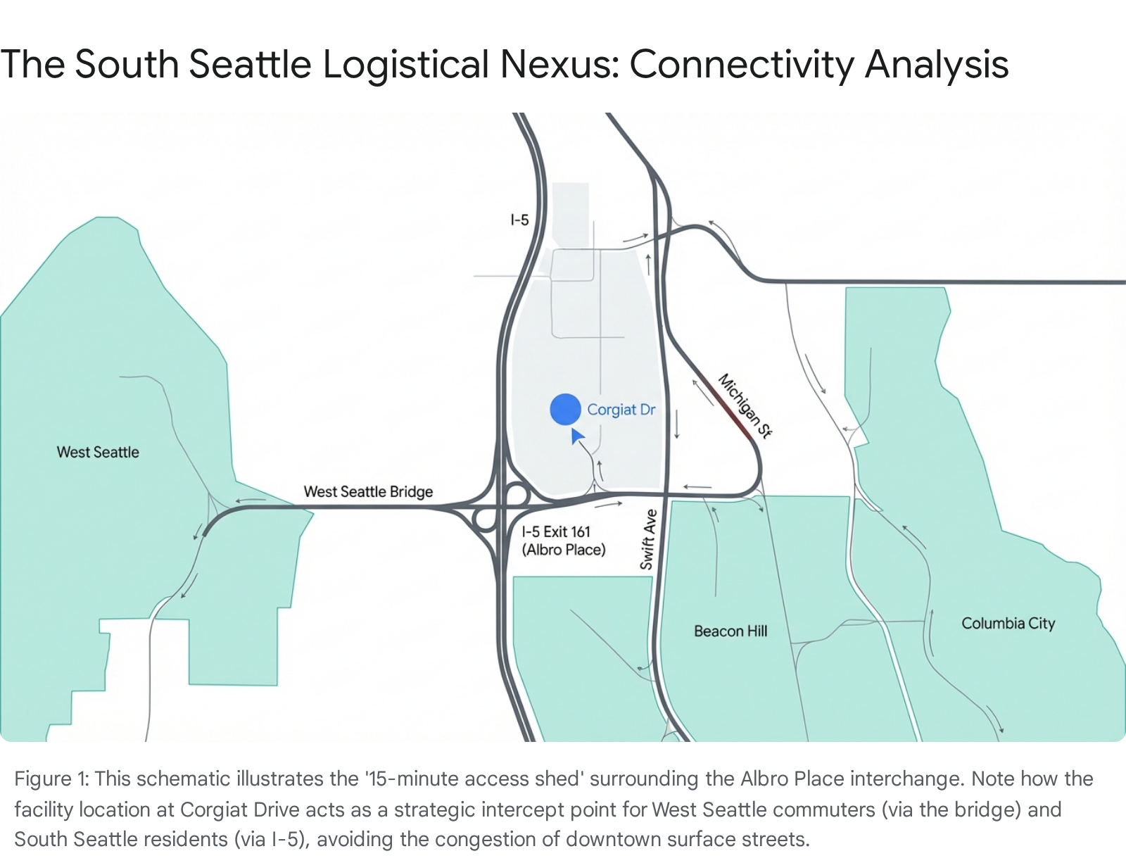 The Southbound Logistics Flow: Traffic engineering data suggests that the most efficient egress from West Seattle for logistics purposes is the eastbound crossing of the West Seattle Bridge, merging directly onto I-5 South.7 The Albro Place exit (Exit 161) is the first major interchange encountered, acting as a natural "intercept point" for residents. This makes the Corgiat Drive facility logistically closer in time to West Seattle than many facilities geographically closer but buried in the congestion of Delridge or White Center.4