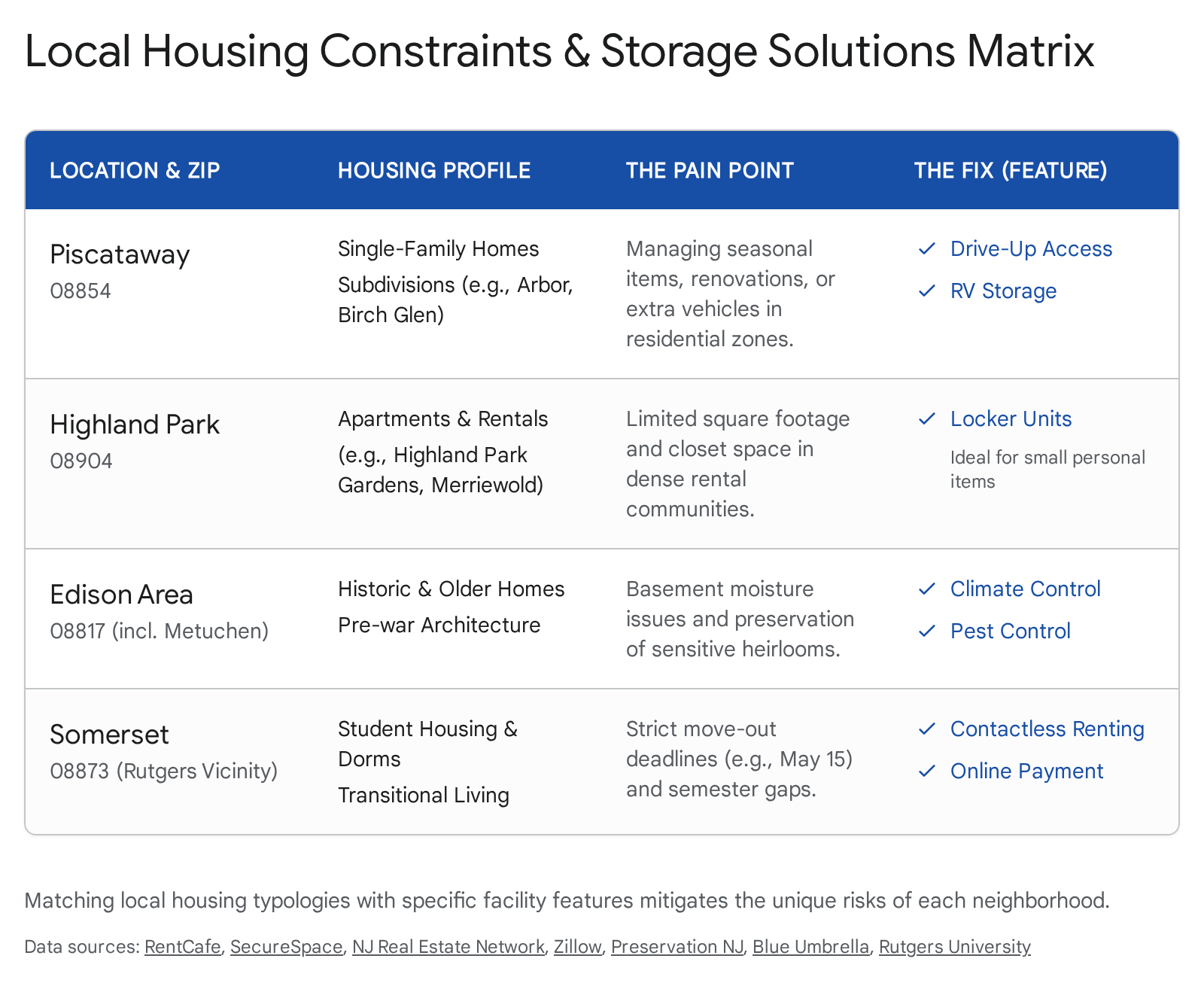 For the residents of the ten primary ZIP codes surrounding the Stelton Road corridor (07080, 08817, 08820, 08837, 08840, 08846, 08854, 08873, 08901, 08904), the challenge of storage is rarely about simple accumulation. It is about the friction of daily life. It is about the friction of managing a multi-generational household in Edison where every bedroom is occupied.4 It is about the friction of preserving heirlooms in a Highland Park basement that battles the high water table of the Raritan River.5 It is about the friction of the Rutgers academic calendar, which creates bi-annual tidal waves of displacement that strain local infrastructure.6