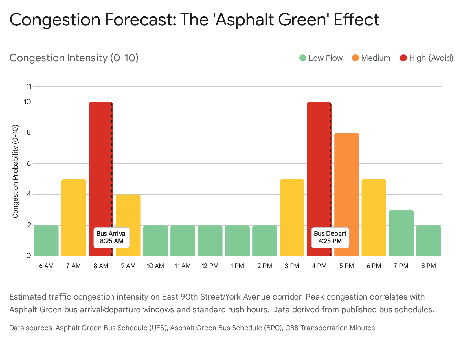 Operational Recommendation: It is highly advisable to avoid scheduling large move-ins or move-outs during the Asphalt Green intake/dismissal windows (8:00–9:00 AM and 4:00–5:30 PM on weekdays). Saturday mornings also see high activity due to sports leagues and swim meets. Attempting to maneuver a 20-foot moving truck through this congestion adds significant time and stress to the process.