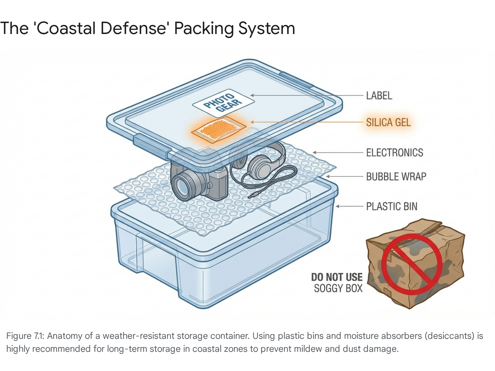 The Micro-Climate: Place silica gel packets or moisture absorbers (like DampRid) inside bins containing high-value items (electronics, leather, photos). This creates a dry micro-environment within the container.9