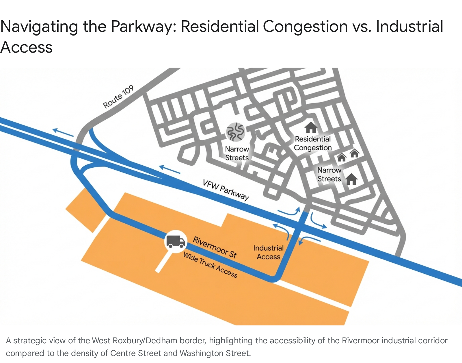 The primary access route to the Rivermoor Industrial Park is the Veterans of Foreign Wars (VFW) Parkway. Designed as a historic parkway, it offers a wider, higher-speed alternative to the congested local streets.24