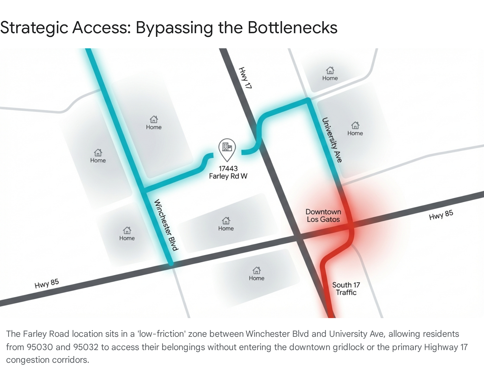The Back Road Network: Residents of 95070 (Saratoga) can access the facility via Daves Avenue to Winchester, completely bypassing downtown Los Gatos.14