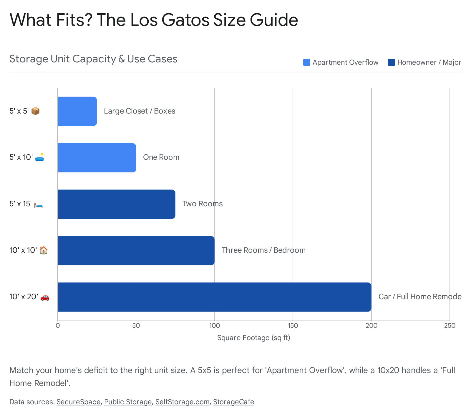 The "Condo Closet" (5x5 Unit): Roughly 25 sq. ft. Equivalent to a large walk-in closet. Ideal for the overflow from a Pruneyard apartment—seasonal clothes, luggage, and 5-10 boxes.18